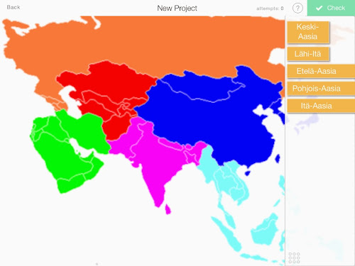 Varsinainen pelin alkunäkymä on tällainen. Tarrat ovat oikeassa reunassa ja ne siirretään kartalle sormella. Kun olet valmis voit painaa check-nappia ja tarkastaa osaamisesi. Jos laitoit tarrat oikein, peli onnittelee sinua. Alla kuva kun tarrat on siirretty kartalle.